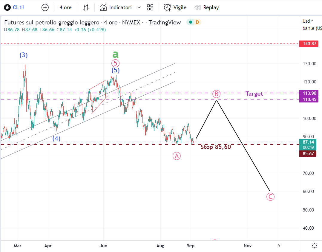 L’onda (4) ci ha fatto dannare per poi trasformarsi in un triangolo giunto all’ultimo segmento di onda D. L’onda E dovrebbe infine riportare i prezzi sui livelli attuali per poi lanciare l’onda (5). Vediamo se giocarci un terzo lotto da quelle parti..