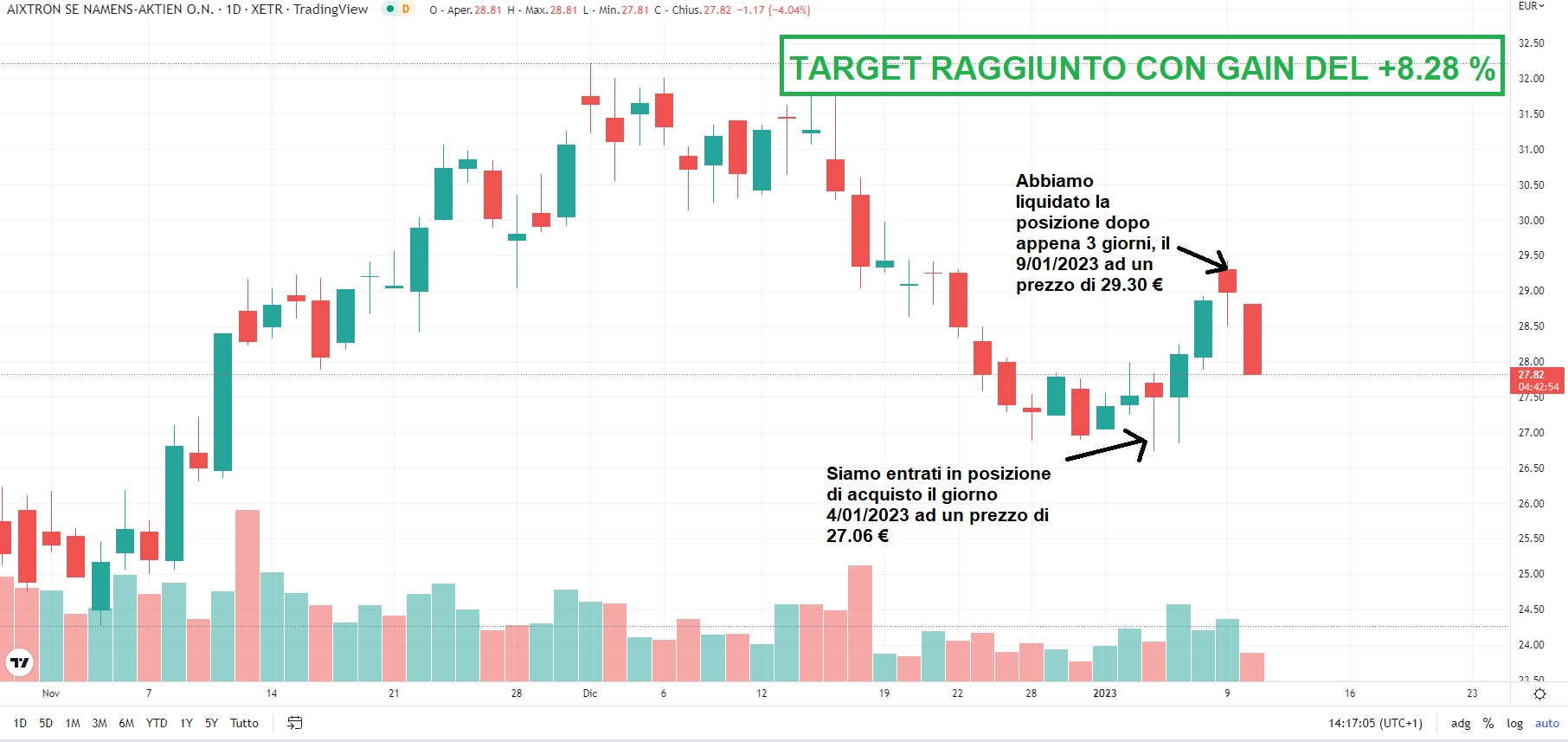 Come potete apprezzare dal grafico, siamo entrati in posizione di acquisto ad inizio anno, precisamente lo scorso 4 gennaio 2023 ad un prezzo di 27.06 € e, dopo soli 3 giorni, abbiamo liquidato la posizione il giorno 9 gennaio 2023 in apertura di contrattazioni ad un prezzo di 29.30 €.