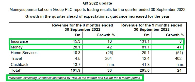 Seguendo questa corretta logica, a parità di perimetro, MONEYSUPERMARKET ha riportato ricavi superiori del 6,3%. Molto positivo il contributo del 3Q (+15%).