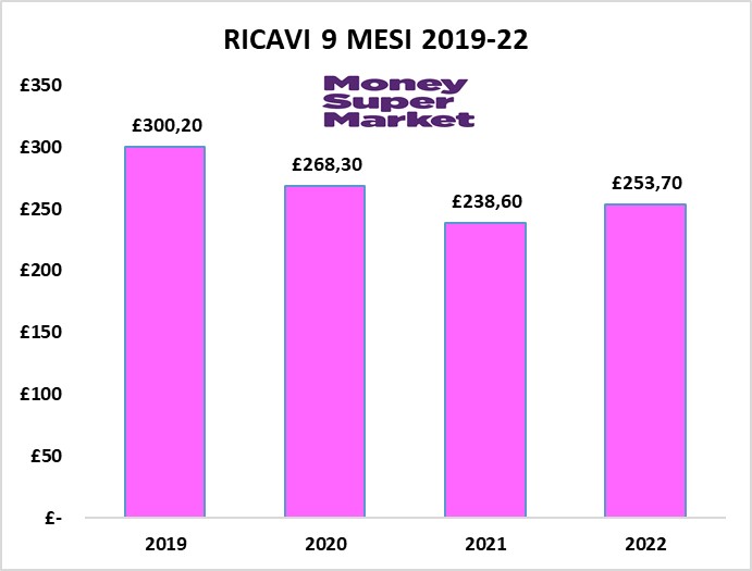 Rispetto al periodo pre-Covid (escludendo il contributo del settore Cashback) manca ancora un 15,49% (£ 300,2 mln vs 253,7 mln). Il comparto Money ha superato i livelli pre-crisi (+20%), l'Insurance si sta avvicinando al recupero integrale (-10%) mentre all'appello manca il contributo dell'Home Service, settore gravemente impattato dall'andamento dei prezzi dell'energia.