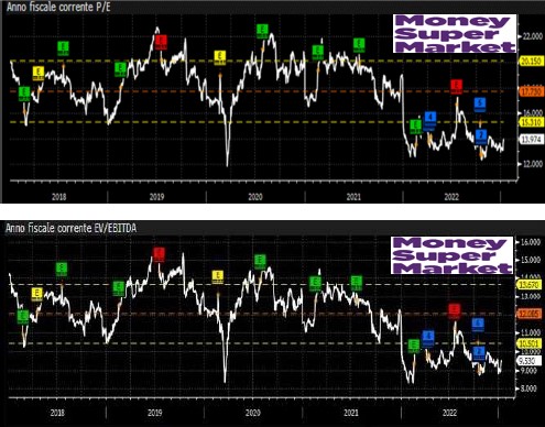 Alla medesima conclusione si giunge analizzando la figura che segue nella quale sono riportati gli andamenti del P/E e EV/EBITDA nell'ottica forward: i valori attuali sono distanti ben più di una variazione standard rispetto alla media registrata negli ultimi cinque anni.