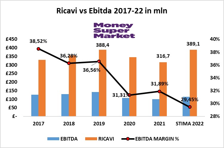 Al momento, per il 2022, gli analisti prevedono un EBITDA complessivo tra i £ 109-118 mln (vs £ 101 nel 2021).
