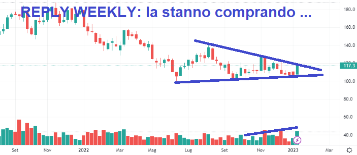 REPLY: uno dei migliori titoli del listino azionario italiano per fondamentali. Quota a sconto per il modello dei flussi di cassa di più del 20%. Ha un tasso di crescita a 3 anni composto degli EPS senza NRI del 14%. Spettacolo. A livello fondamentale abbiamo un triangolo con incremento dei volumi.