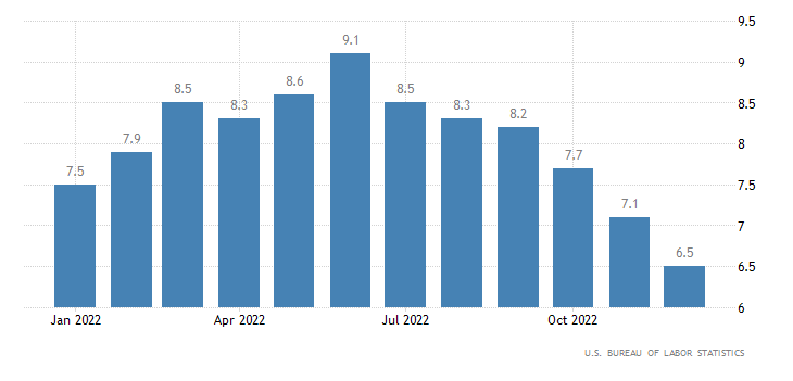 L'inflazione USA di dicembre è uscita totalmente in linea con le attese. Questo non toglie che il calo sia significativo e la headline in disinflazione. Per il sesto mese consecutivo l’indice dei prezzi al consumo a livello annualizzato registra un rallentamento. A dicembre il dato si attesta al 6,5%, in linea con il consensus proprio del 6,5% e sotto al 7,1% di novembre. Il dato è rilasciato dall’U.S. Bureau of Labor Statistics.