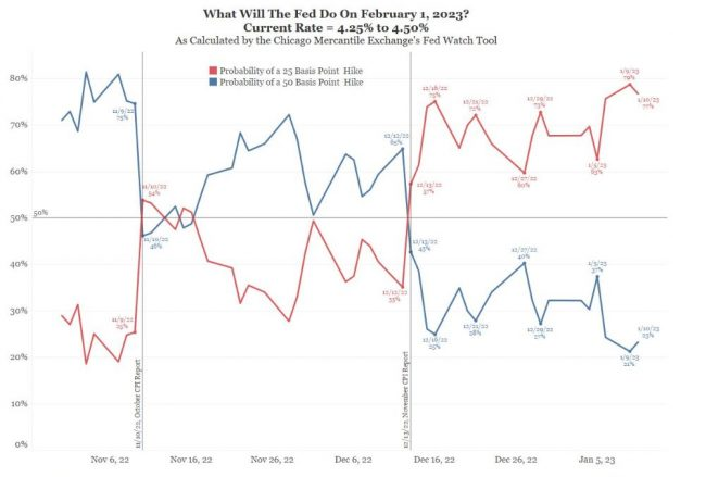 Gli operatori del mercato monetario, ad inizio della settimana appena trascorsa, al pari del calo del Dollar Index, hanno visto il movimento dei rendimenti dei Bonds scendere con la curva che è tornata a prezzare un picco dei Fed Funds a giugno al 4.95% (quindi sotto il 5%) e 50 bps di tagli entro dicembre 2023. Per il FOMC del primo febbraio la curva sconta con maggior probabilità rialzi di 25 bps e altri 25 per marzo con il mercato che va incontro a quest'evento mettendo chiaramente in discussione lo scenario della FED, e con un chiaro allentamento delle condizioni finanziarie, proprio quello scenario contro il quale le minute FOMC mettevano in guardia. Ma proprio dopo l’uscita del dato sull’inflazione, il presidente della Fed di Philadelphia, Patrick Harker, ha dichiarato che per Febbraio lui opterebbe per un rialzo di 25 bps. Considerando che è membro votante, è comunque un’indicazione importante.