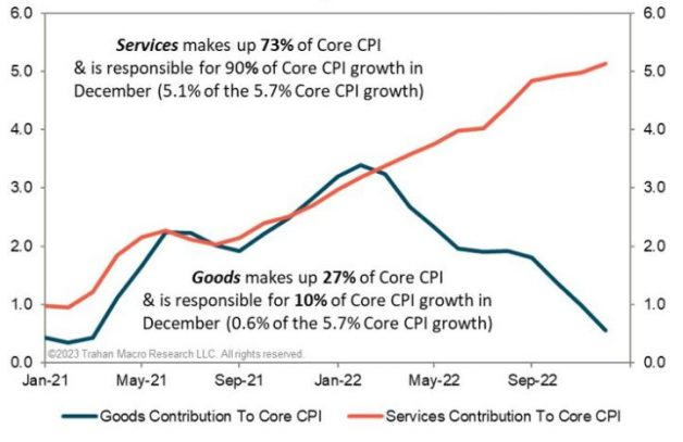 Passando ad analizzare il livello dei dati macro, il CPI è uscito perfettamente in linea alle attese confermando il trend di raffreddamento. Il report ha sostanzialmente confermato la disinflazione nella componente dei beni “core”, così come però la resilienza nella componente dei servizi, che ormai è responsabile del 90% dal dato “core”.
