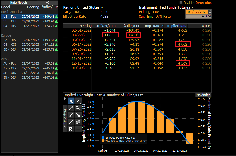 Dopo il dato sull’inflazione, il mercato continua a mettere in dubbio le parole della FED fino a quasi ignorarle, è interessante notare che ormai nella Fed Funds Strip non ci sono più nemmeno 2 rialzi di 25 bps prezzati per i FOMC del primo febbraio e del 22 marzo. In altre parole il mercato inizia ad attribuire una piccola probabilità alla circostanza che il rialzo di Febbraio per la Fed sia l'ultimo (v. grafico):