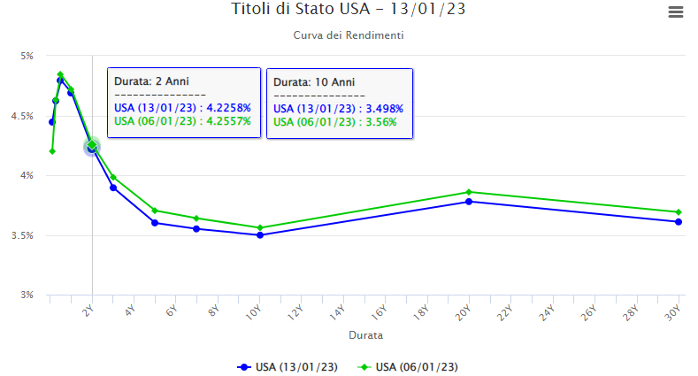 Nel grafico comparativo settimanale delle varie scadenze tra la chiusura di due venerdì fa 06 gennaio e la chiusura di venerdì scorso 13 gennaio 2023, si nota come la curva dei rendimenti in percentuale delle scadenze si sia ulteriormente abbassata dopo l’uscita del dato sui CPI: