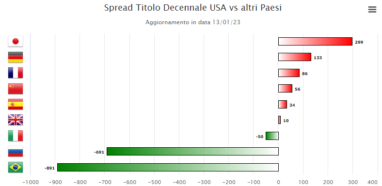 Infine riportiamo lo spread del Treasury decennale USA rispetto all'omologo titolo dei principali paesi mondiali a venerdì 13 gennaio 2023: