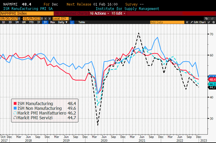 Al momento tutti i principali indici di diffusione USA segnalano contrazione, sia pure moderata nel caso degli ISM. Tra l'altro, diversamente dall'ISM manifatturiero, l'ISM servizi non è mai calato sotto 50 dal 2009 in poi, se non per 2 mesi nel 2020, durante l'esplosione del Covid (aprile e maggio 2020). E ricordiamo che la FED è ancora nell'atto di alzare i tassi continuando a focalizzarsi su occupazione e inflazione, ovvero variabili che seguono il ciclo e non lo precedono.
