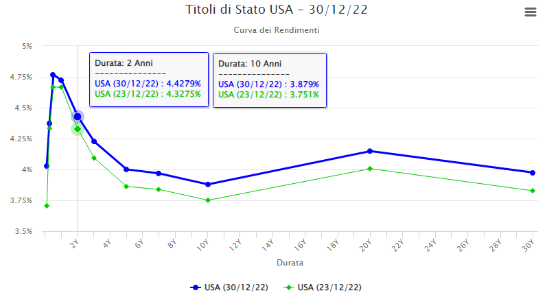 Nel grafico comparativo settimanale delle varie scadenze tra la chiusura di due venerdì fa 23 dicembre e la chiusura di venerdì scorso 30 dicembre si notano sostanziali differenze con quasi tutte le scadenze al rialzo: