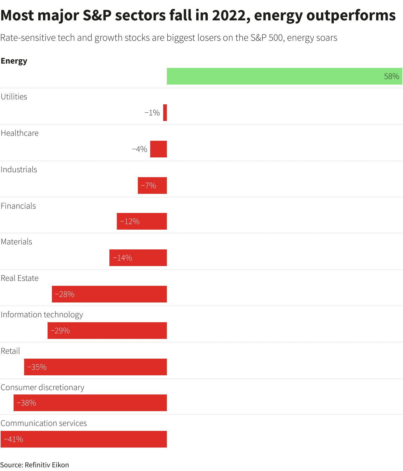 I cali percentuali annuali per tutti e tre gli indici sono stati i maggiori dalla crisi finanziaria del 2008. L’S&P500 ha lasciato sul parterre circa 8 trilioni di dollari di capitalizzazione, mentre l’indice tecnologico ha riportato una perdita del 33% nei quali i colossi del settore Apple, Alphabet, Microsoft, Nvidia, Amazon, Meta Platforms e Tesla sono tra i peggiori in calo tra il 28% e il 66% nel 2022. Solo i titoli del settore Energy hanno registrato guadagni stellari grazie all’aumento dei prezzi petroliferi. Di seguito il grafico delle performance dei vari settori: