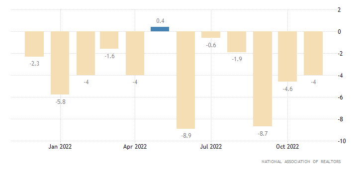 A livello mensile, a novembre il dato sulle vendite immobiliari in corso (che misura il cambiamento nel numero di case con contratto di vendita, ma in attesa della transazione di chiusura, escludendo le nuove costruzioni) segna un -4,0%, contro una rilevazione di ottobre del – 4,6% e contro un ottimistico dato degli analisti a + 0,6%. Il dato è rilasciato dalla National Association of Realtors.