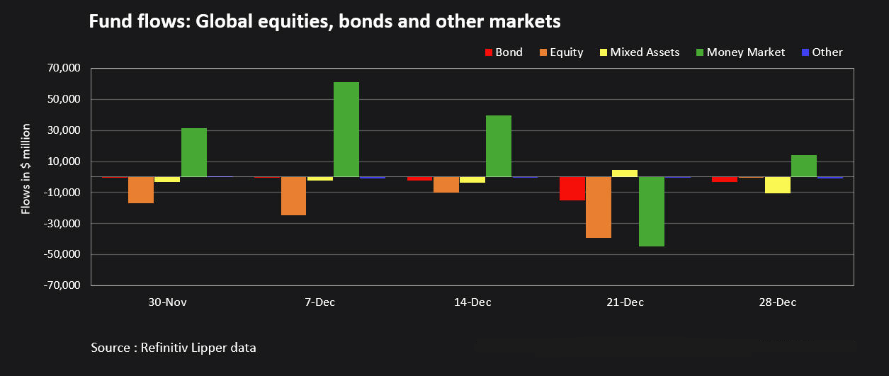 I fondi azionari globali hanno registrato deflussi netti per l'ottava settimana consecutiva nei sette giorni fino al 28 dicembre, poiché una lettura del PIL statunitense più forte del previsto ha sollevato timori che i tassi di interesse statunitensi possano rimanere più alti più a lungo.