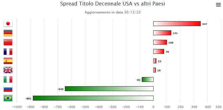 Infine riportiamo lo spread del Treasury decennale USA rispetto all'omologo titolo dei principali paesi mondiali a venerdì 23 dicembre.