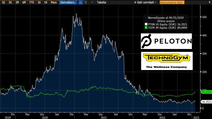TECHONOGYM nel medesimo periodo non ha avuto un andamento esaltante (-11%) ma rispetto al colosso PELOTON (-64%) si è difesa decisamente meglio.