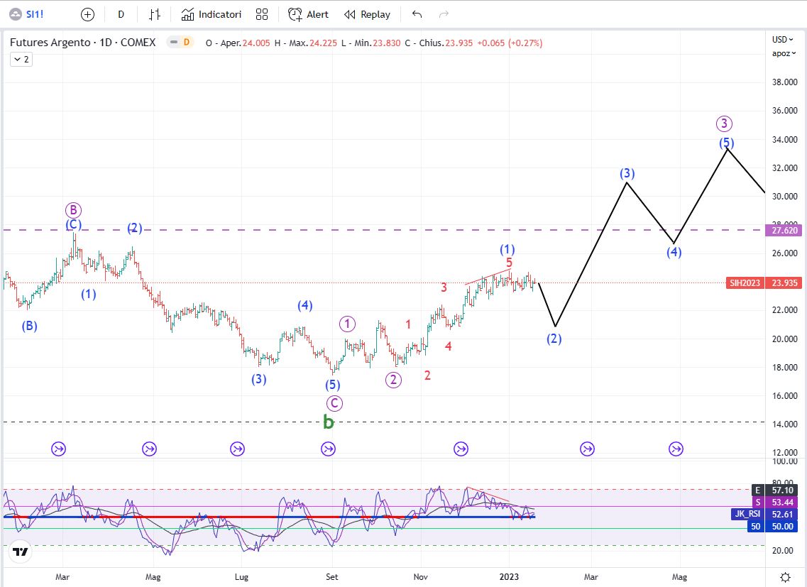 L’oro teoricamente ha concluso l’onda b sul ritracciamento del 61,8% dell’onda a di grado cycle. Noi abbiamo chiuso la posizione in utile dopo essere stati in perdita per molti mesi ed ora vediamo cosa viene avanti: se inizierà un’onda c al ribasso, aspetteremo un 1-2 per aprire una posizione short. Se continuerà a salire vediamo come proseguirà la suddivisione delle prossime onde.
