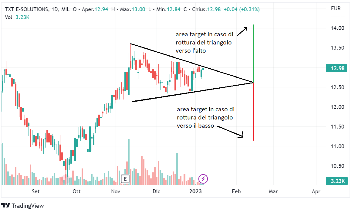 Graficamente, ci troviamo di fronte ad un triangolo simmetrico, piuttosto ampio. La figura presente sul grafico di TXT e-solutions al momento è formata da tre massimi decrescenti e due minimi crescenti. Più nel dettaglio, il primo massimo si attesta a quota 13,60 ed è stato registrato nella seduta dell’11 novembre, al termine di un'importante corsa rialzista partita a fine settembre. Dopo questo primo massimo il titolo è sceso arrivando al minimo di 12,30 dell’8 dicembre. Il secondo massimo è quello di 13,16 del 13 dicembre, mentre il secondo minimo quello di 12,40, toccato nelle sedute del 28-29 dicembre. Il 4 gennaio troviamo il terzo massimo di 13,02, al quale il titolo si è avvicinato il 6 gennaio, registrando una quotazione di 13,00. Da osservare una possibile rottura della figura.