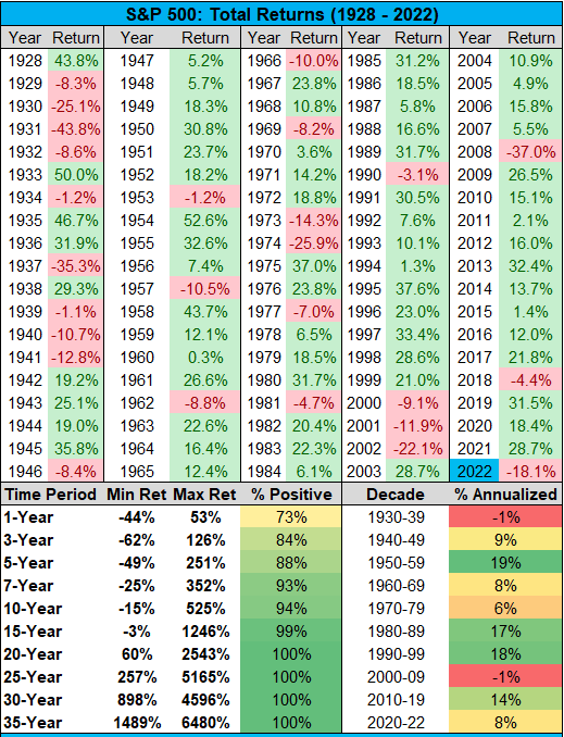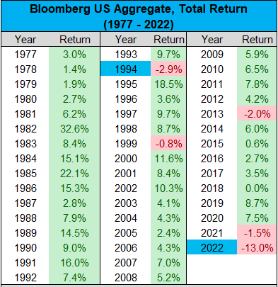 Riportiamo un po' di statistiche dell’anno 2022 rispetto agli anni passati sui mercati azionari ed obbligazionari USA grazie all’aiuto di grafici ben fatti ed aggiornati al 31-12-2022.