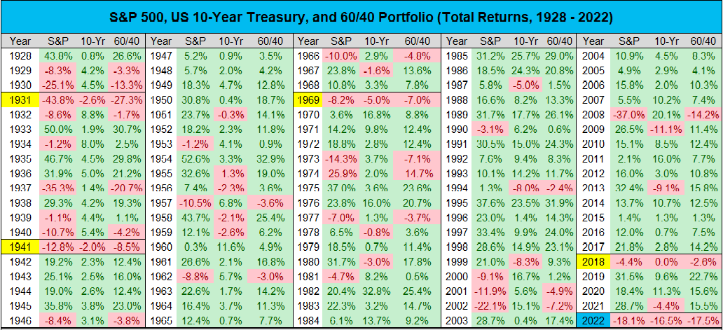 Il 10 anni treasury ha perso il 16.5%, peggior anno della sua storia dal 1938. Il precedente record era del 2019, con -11%. Questa concomitanza di perdite di bonds e azionario è piuttosto rara. E' successo solo 5 volte dal 1928 (1931, 1941, 1969, 2018, 2022). Il classico portafoglio 60 equity 40 bonds (in Europa è forse considerato più classico l'opposto ma cambia poco) ha ceduto il 17.5% nel 2022, la peggior performance dal 1937 e la terza peggiore assoluta, battuta dal 1931 (-27.3%) e dal 1937 (-20.7%.)
