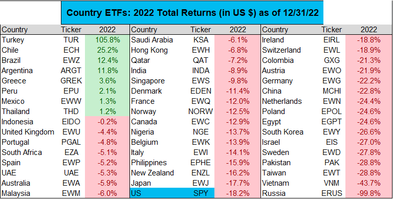 Tra le principali piazze globali solo UK, Brasile, Mumbai, Jakarta, Grecia, Portogallo e Turchia hanno prodotto progressi nell'anno. il MSCI World ha chiuso a -19% e il MSCI Emerging a -22%. Qui sotto una carrellata di ETF, contro valorizzati in Dollari.