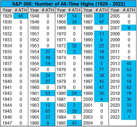 Nel seguente schema vi sono riportati i nuovi massimi registrati dall'S&P500 per ogni anno dal 1929. Come si nota, la serie più lunga di anni consecutivi in cui sono stati registrati nuovi massimi è dal 1989 al 2000 (12), ma anche quelle dal 1963 al 1968 (6) e quella dal 2013 al 2022 (9) sono abbastanza estese (anche se l'anno scorso se ne è registrato solo uno, alla seconda seduta dell'anno).