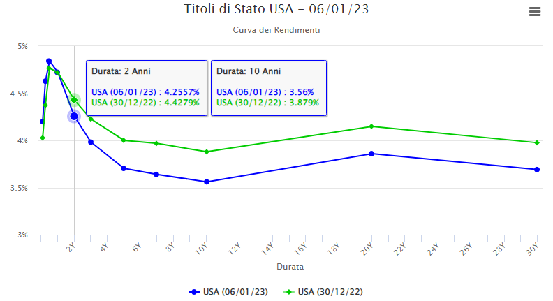Gli operatori del mercato monetario, nella prima settimana dell’anno, al pari dei movimenti del Dollar Index, hanno visto il movimento dei Bonds crescere il 2Y al 4,51% massimo di oltre due mesi ed il rendimento a 10 anni al 3,848% per poi, dopo i dati macro di venerdì, scendere bruscamente il primo al 4,256% ed il 10Y al 3,56%. Questi movimenti hanno riportato lo spread 2Y/10Y a 69 bps dai 54,9 bps di fine anno.