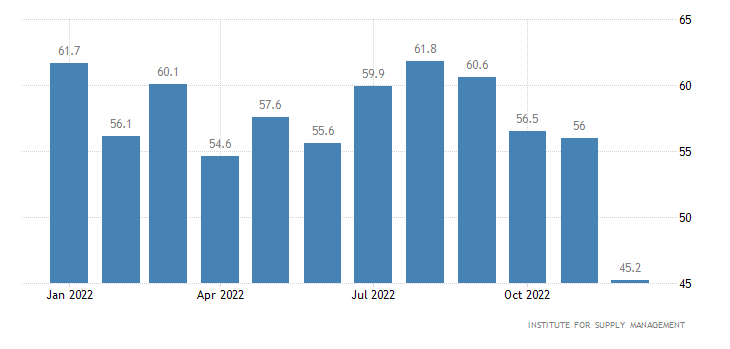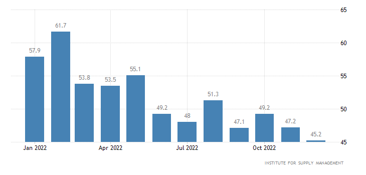 L’indice di ISM relativo ai nuovi ordini manifatturieri perde due punti, dai 47,2 punti di novembre ai 45,2 di dicembre.