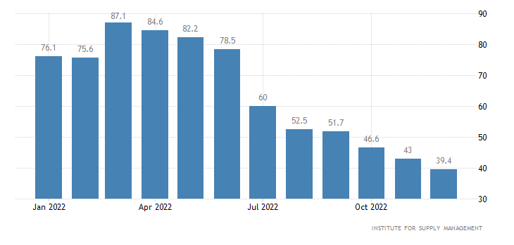 Infine, il dato di ISM sui prezzi manifatturieri si attesta ben al di sotto del consensus di 42,6 punti, passando dai 43,0 punti di novembre ai 39,4 di dicembre.