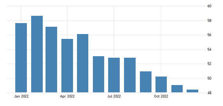 Il dato dell’indice passa dai 49,0 punti di novembre ai 48,4 punti di dicembre, appena sotto al consensus di 48,5 punti.