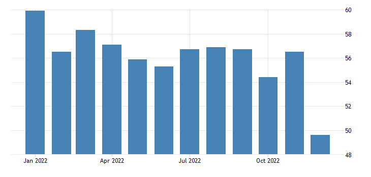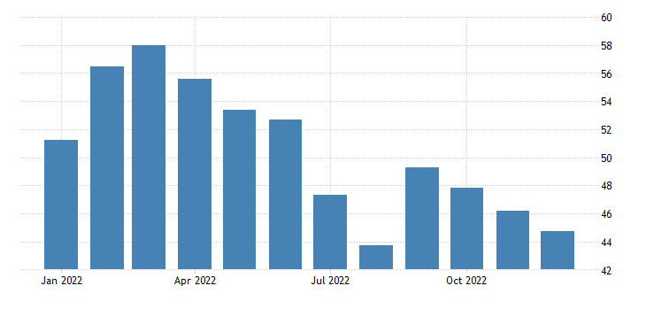 Il PMI S&P Global del settore dei servizi per il terzo mese consecutivo segna un calo, passando dai 46,2 punti di novembre ai 44,7 punti di dicembre. Una rilevazione che si attesta appena sopra al dato preliminare di dicembre di 44,4 punti. Il dato è rilasciato da Markit Economics.