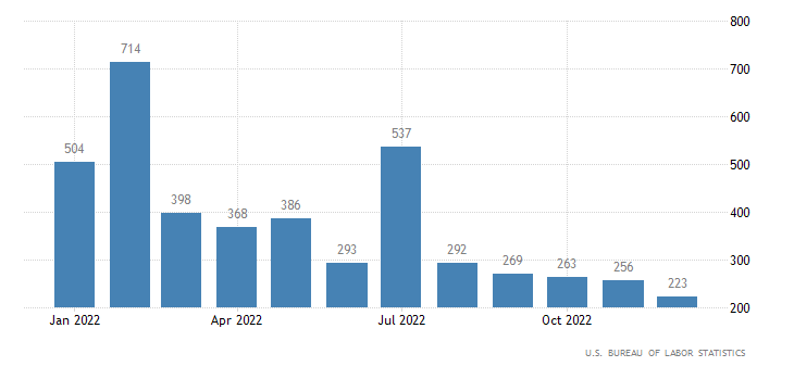Le richieste iniziali di sussidi di disoccupazione sono usciti più bassi delle stime. Trattandosi della settimana delle feste, è un numero soggetto a distorsioni e destagionalizzazione complessa. Nell’ultima settimana del 2022 sono state 204 mila, ovvero meno rispetto alla rilevazione di 223 mila della settimana precedente (rivista da 225 mila) ed anche al consensus di 225 mila. Il dato è rilasciato dall’U.S. Department of Labor.