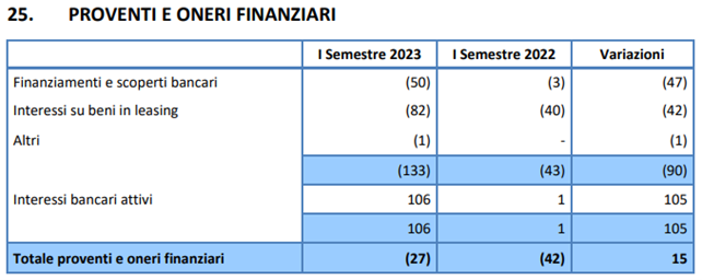 Addirittura, il totale dei proventi e degli oneri finanziari pagati nel I semestre 2023 si è ridotto rispetto al I semestre 2022 (da € 42mila a € 27mila), grazie all’aumento più che proporzionale degli interessi attivi sulla liquidità rispetto agli interesse passivi sul debito.