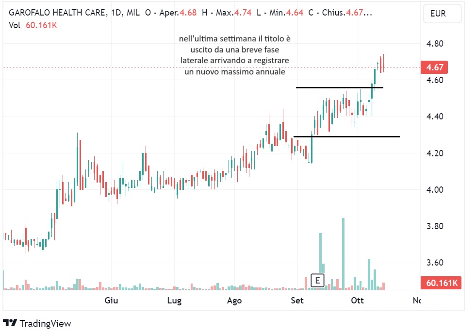 Nella settimana appena terminata il titolo è uscito da una breve fase di lateralizzazione delimitata nel lato alto da un massimo in area 4,5 e nel lato basso dall’area 4,3 (la resistenza precedente che ora sembra rappresentare un livello di supporto). Lateralizzazione durata appunto da circa metà settembre ad inizio ottobre. Negli ultimi giorni, infatti, il titolo si è spinto verso l’alto; lunedì 9 ottobre Garofalo Health Care ha registrato un massimo di 4,60 ed una chiusura a 4,58, venerdì 13 ottobre è arrivato a toccare un massimo di 4,74 (quotazione più elevata da maggio 2022), con una chiusura a 4,67.