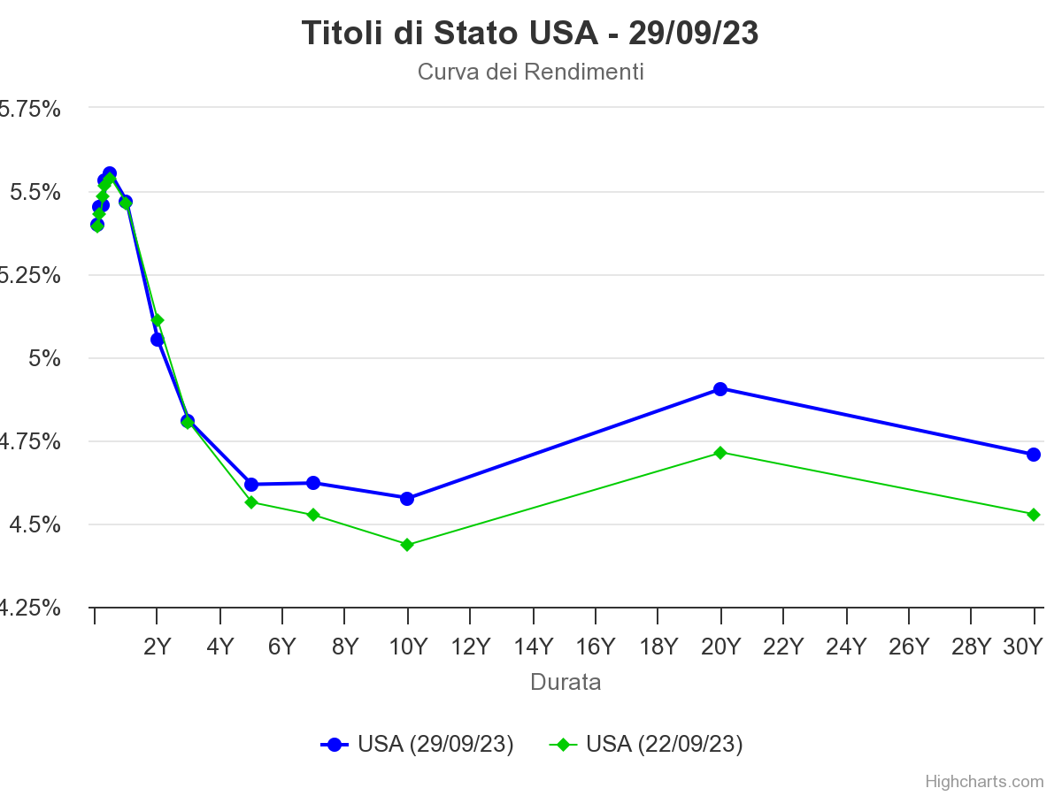 Nella settimana appena trascorsa, dopo l’uscita dei dati macro dei beni durevoli la curva dei rendimenti dei titoli del Tesoro a lunga durata si è irripidita sia con il 10 anni che ha fatto registrare un nuovo massimo attestandosi al 4,688%, il più alto dall’ottobre 2007 che con il 30 anni che si è portato al 4,808% per poi ridiscendere in chiusura di settimana dopo l’uscita del dato sui consumi personali. Il 2 anni è rimasto sostanzialmente su un rendimento del 5,10/5,15% per scendere in chiusura di settimana al 5,05%. Lo spread delle curve del 2Y e del 10Y ha chiuso la settimana a 47 dai 68 di due venerdì fa.