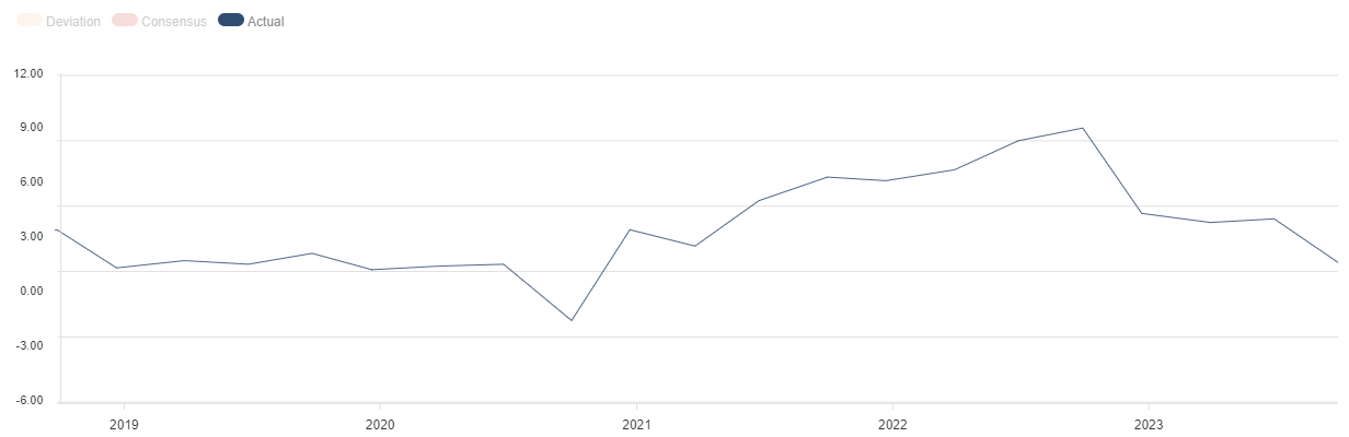 L’indice dei prezzi PIL nel secondo trimestre 2023 è all’1,7%; dato inferiore al consensus del 2%. Il dato è rilasciato dall’U.S. Bureau of Economic Analysis.