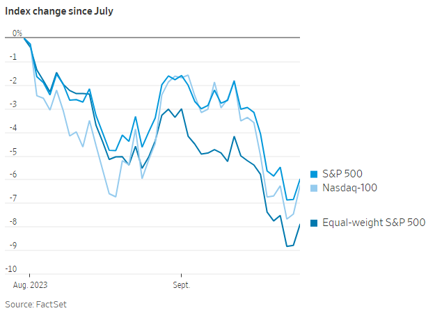 A settembre, l’S&P500 è crollato del 4,87%, il Dow è sceso del 3,5% e il Nasdaq100 è sceso del 5,07% registrando i maggiori cali percentuali mensili dell’anno. Nel trimestre luglio-settembre tutti e tre i principali indici hanno registrato i primi cali del 2023, l'S&P500 è sceso di circa il 3,65%, il Dow il 2,62%, il Nasdaq100 il 3,06%. Il problema è che l’indice S&P500 di pari peso è sceso più ampiamente, scendendo dell’8,2%, anche più del Nasdaq100, dominato dalle Big Tech. Dovrebbe essere il contrario. Questa volta l’intelligenza artificiale non è un’ottima spiegazione per la sovraperformance tecnologica, perché l’entusiasmo per l’intelligenza artificiale è diminuito da luglio (v. grafico):