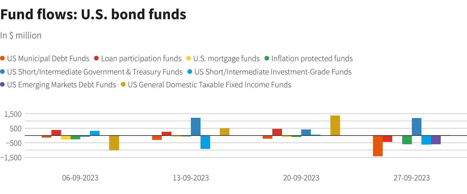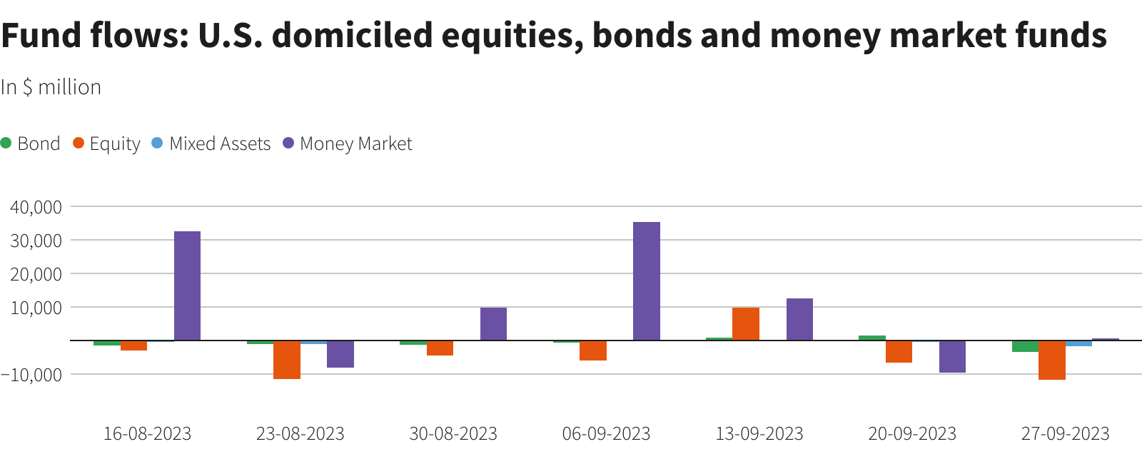 I fondi azionari statunitensi hanno assistito a forti deflussi nella settimana terminata il ​​27 settembre a causa dei timori su una potenziale estensione della politica monetaria restrittiva della Federal Reserve e su una rinnovata impennata dei rendimenti dei titoli del Tesoro. Secondo i dati LSEG, i fondi azionari statunitensi hanno subito deflussi netti pari a 11,69 mld $, i più ampi settimanali dal 21 giugno.