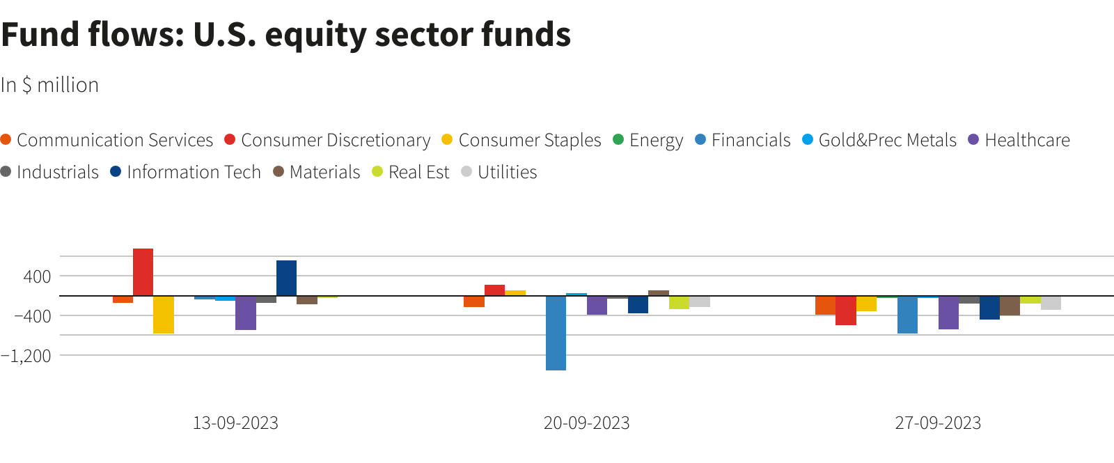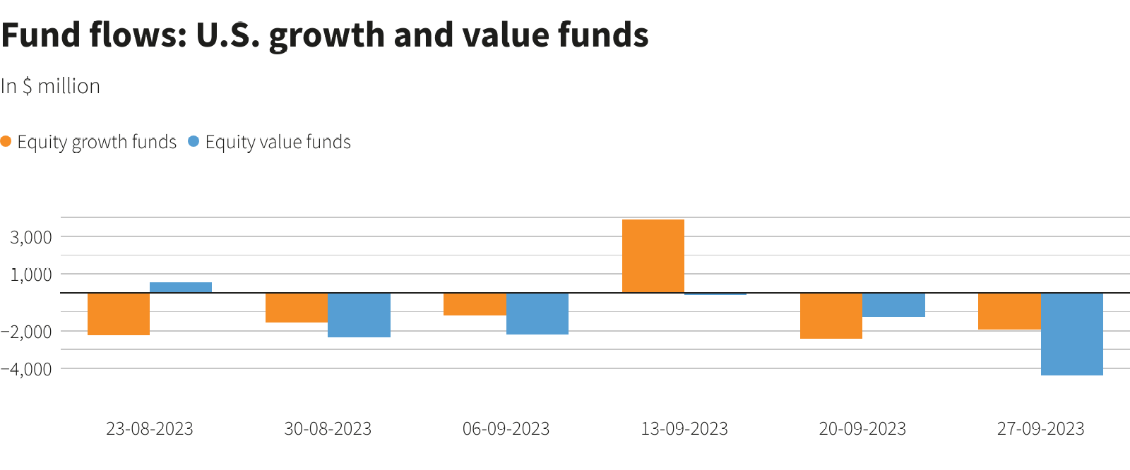 Gli investitori erano preoccupati per la politica sui tassi statunitensi poiché le osservazioni di diversi funzionari della FED hanno riaffermato un periodo più lungo e probabilmente più restrittiva per domare l'inflazione. La banca centrale ha mantenuto i tassi di interesse invariati la scorsa settimana, ma ha segnalato la possibilità di un ulteriore aumento dei tassi per fine anno e di minori tagli l’anno prossimo. La conseguente impennata dei rendimenti dei titoli del Tesoro ha colpito anche le azioni. Questa settimana i rendimenti dei titoli di riferimento statunitensi a 10 anni sono saliti al 4,688%, il livello più alto dall’ottobre 2007. I fondi azionari hanno osservato deflussi per 4,37 mld $, il massimo da dicembre 2022. Nel frattempo, i fondi azionari ad alta crescita (growth) hanno registrato deflussi netti per circa 1,95 mld $.