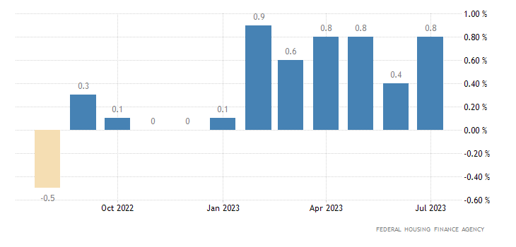 L’indice di prezzo delle case, invece, a livello mensile a luglio registra un +0,8%, crescita superiore al +0,5% indicato dal consensus e al +0,4% di giugno (rivisto da +0,3%). Il dato è rilasciato dalla Federal Housing Finance Agency.