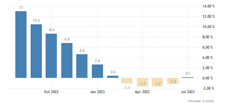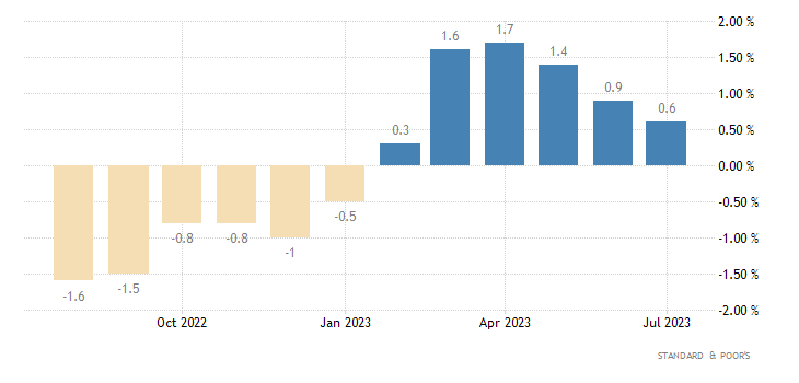 L’S&P/Case-Shiller Home Price Index rilasciato da Standard & Poor’s, che valuta le variazioni nel valore del mercato immobiliare residenziale in 20 regioni degli USA, a livello mensile a luglio è allo 0,6%, in calo rispetto allo 0,9% di giugno.