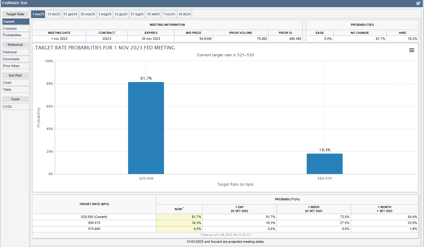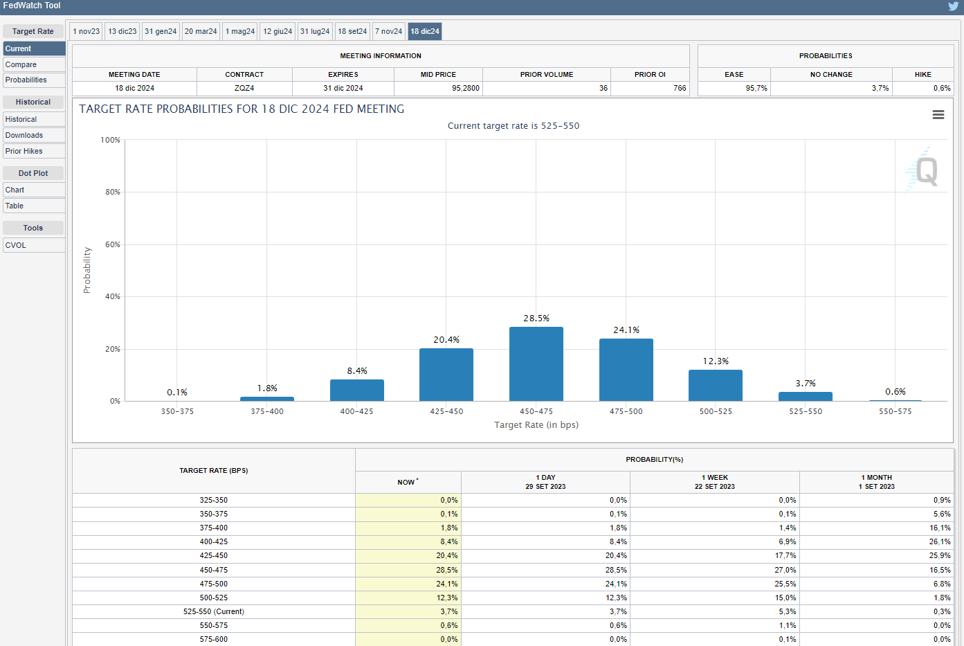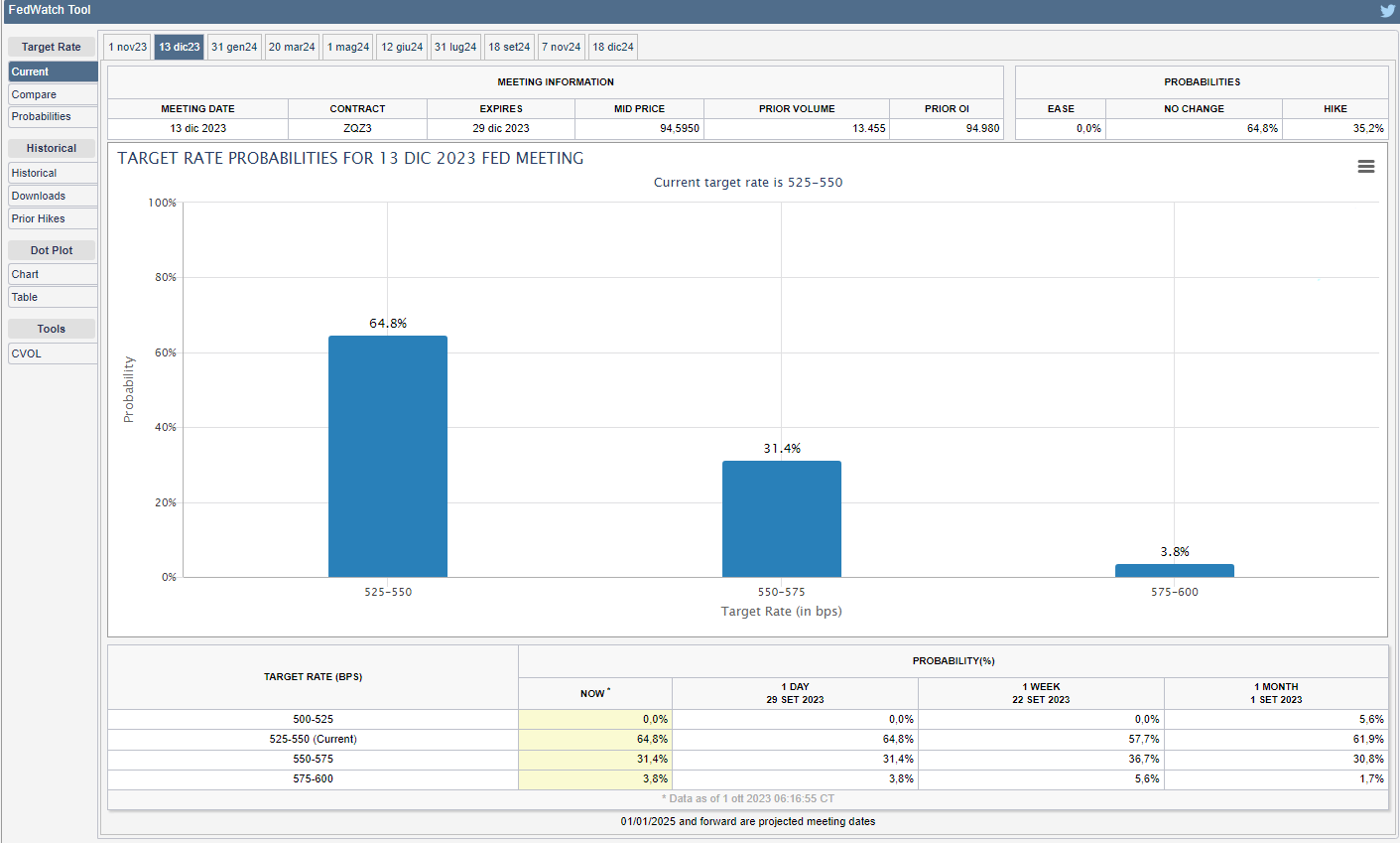 Così come si sono abbassate le probabilità al 31,4% dal 36,7%, di un aumento di 25 bps per l’ultima riunione del 2023 del 13 dicembre (v. grafico):