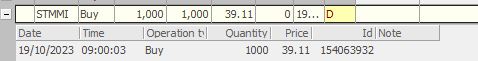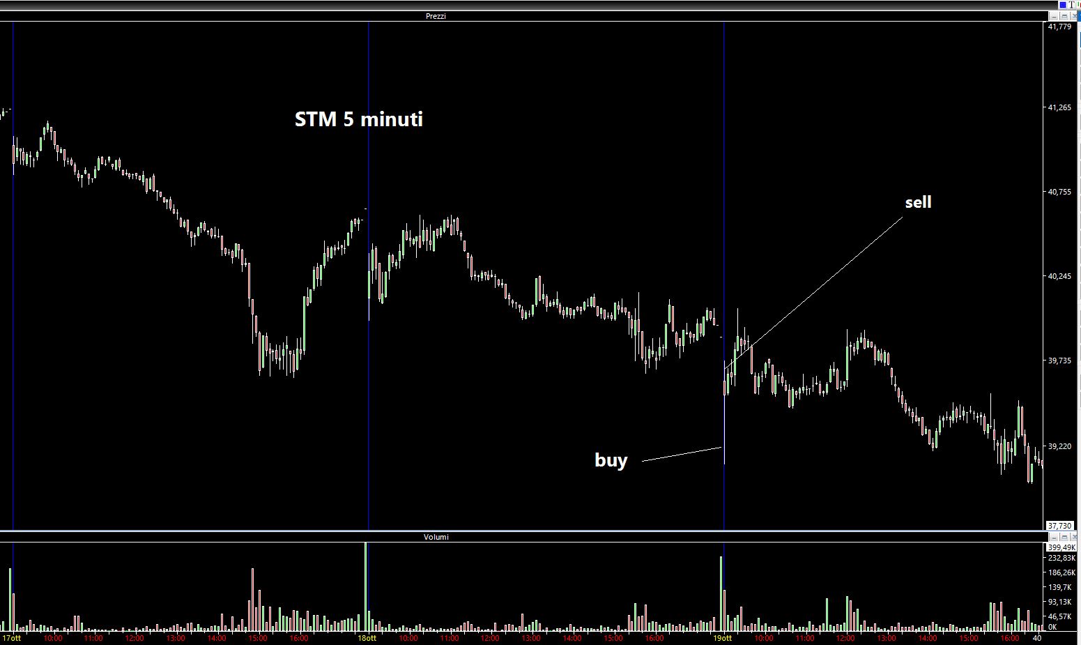 Se l'esempio precedente riguardava un "bottom fishing" al contrario (vendo il massimo e compro il minimo), altre volte c'è il classico bottom fishing extreme come lo chiamo io: compro il minimo e vendo il massimo (o un suo intorno). Questa volta passiamo ad un titolo estremamente liquido, anche se aggiungo che la liquidità è comunque SEMPRE fittizia perché i software immettono e tolgono ordini in continuazione senza essere eseguiti e quindi forniscono informazioni estremamente fuorivianti al trader, ma fortunatamente nessuno li ha ancora vietati. L'azione in oggetto è STM sulla quale giovedì ho acquistato quasi il minimo. Scrivo quasi perché il minimo nelle primissime fasi di contrattazione è stato a 39.11 euro e il mio ordine non è stato eseguito. Nulla di male: pinzata una decina di tick sopra il livello e favorita al software in area 39.60 poche decine di secondi dopo.