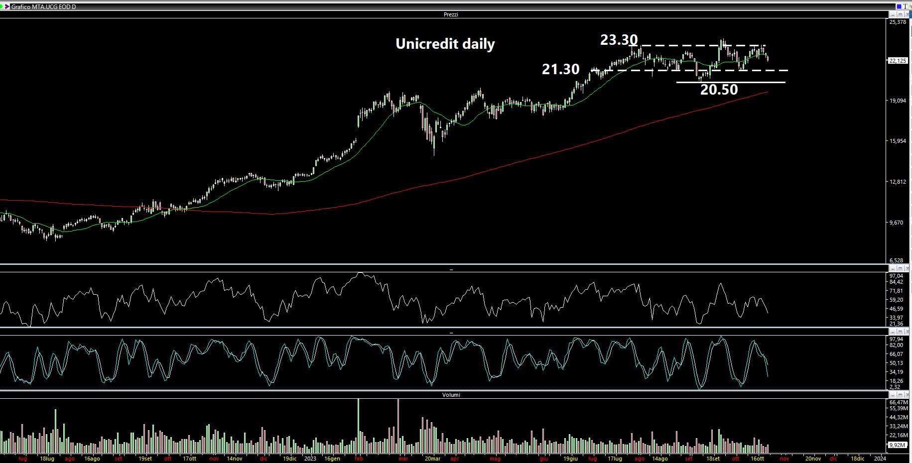 Visto che rimane nella top 5 dei titoli più scambiati, uno sguardo ad Unicredit. Come vedete il comparto bancario è rimasto su livelli più elevati rispetto ad altre azioni. Tolto uno "sbuffo" rialzista sopra 23.30 a metà settembre, pare che l'azione stia tornando verso il supporto a 21.30 (close di venerdì a 22.125 euro). Sotto tale soglia ultimo baluardo a 20.50....insomma: più forte, ma se tutto remasse contro.....