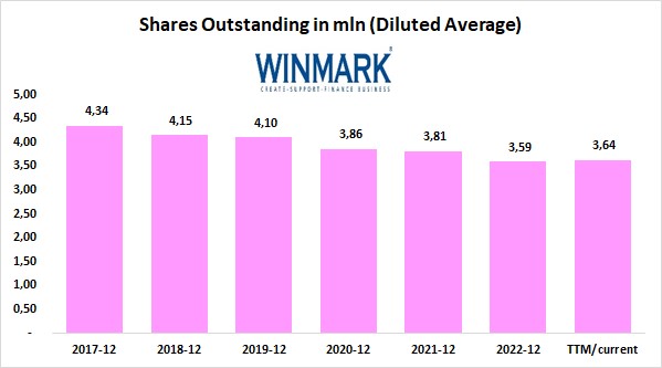 Relativamente al buyback, dal grafico che segue, si apprezza quale sia stato l'effetto sul numero delle azioni in circolazione: dal 2017 ad oggi WINMARK ha ridotto del 16% il numero dei titoli in circolazione (da 4,34 mln a 3,64 mln).