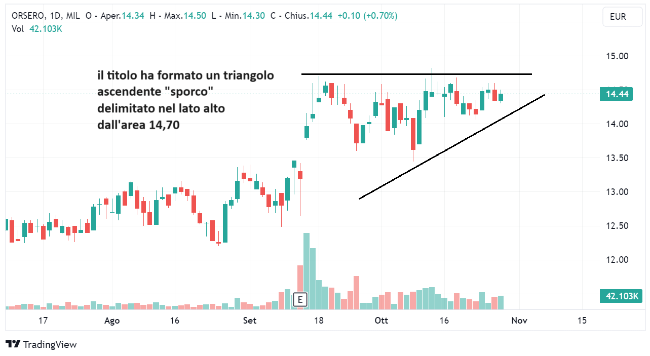 Fari puntati nuovamente su Orsero, titolo di cui avevamo parlato anche ad inizio mese nella rubrica dedicata al Lombard Stock Index. In particolare, nell’articolo del 7 ottobre avevamo segnalato la presenza sul grafico di un triangolo simmetrico formatosi in seguito ad un rialzo partito intorno all’11 settembre. Osservando il grafico ora, come faremo anche a seguire, notiamo come in realtà quello che prima sembrava essere un triangolo simmetrico appare inserito in un movimento più ampio a formare un triangolo ascendente.