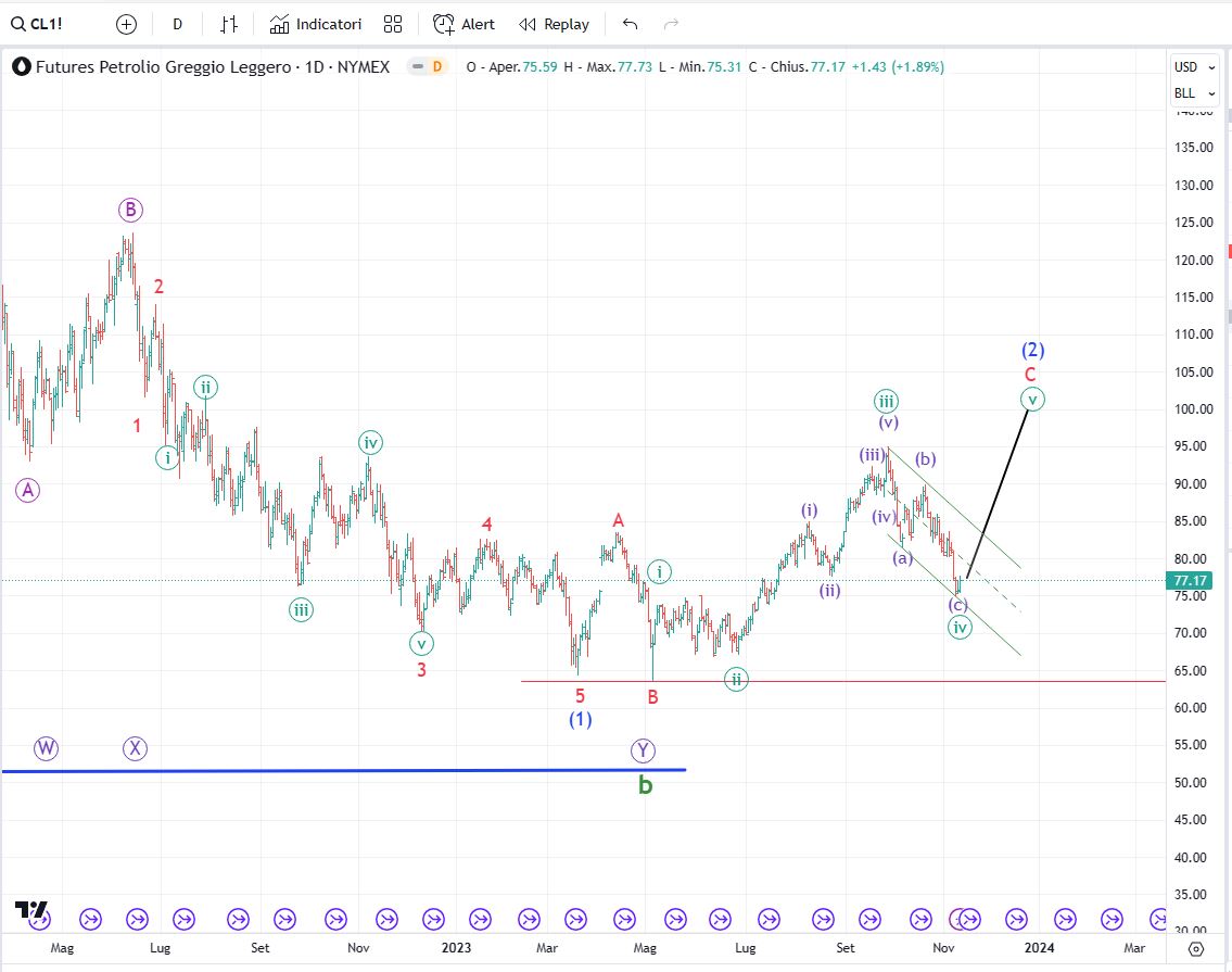 Il Crude Oil col minimo di mercoledì. a 74,91$, potrebbe aver concluso l’onda [iv]. Aspettiamo una conferma per piazzare di nuovo un lotto long.