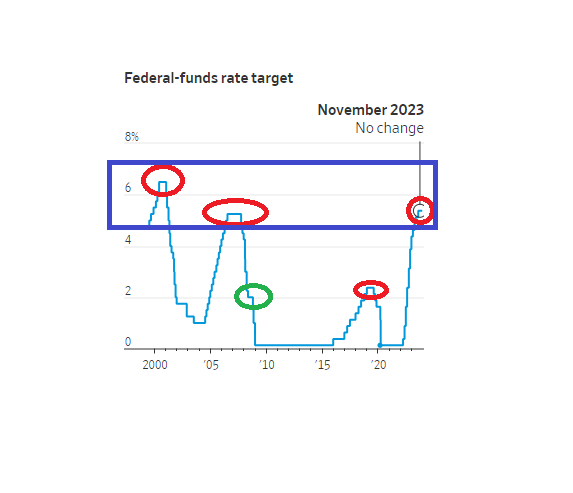 Se guardate il grafico (fonte WSJ) che vi allego qui sotto vedrete che ogni volta che c’è stato un cambio di tendenza nella politica monetaria i tassi sono andati in orizzontale per 2 o più volte (cerchi rossi).