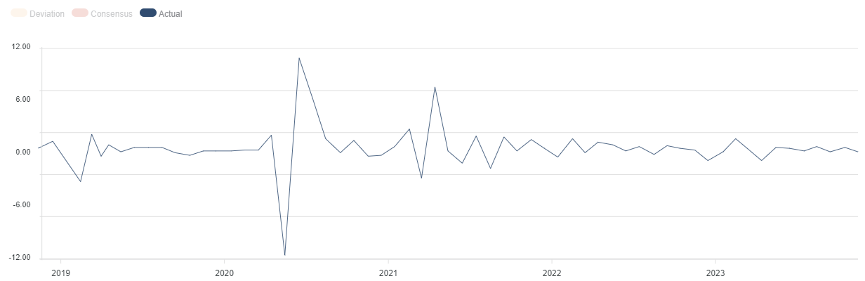 L’indice dei prezzi alla produzione core su base mensile ad ottobre rimane stabile segnando un +0,0%, contro un consensus del +0,3% ed un +0,2% registrato a settembre (rivisto da +0,3%).