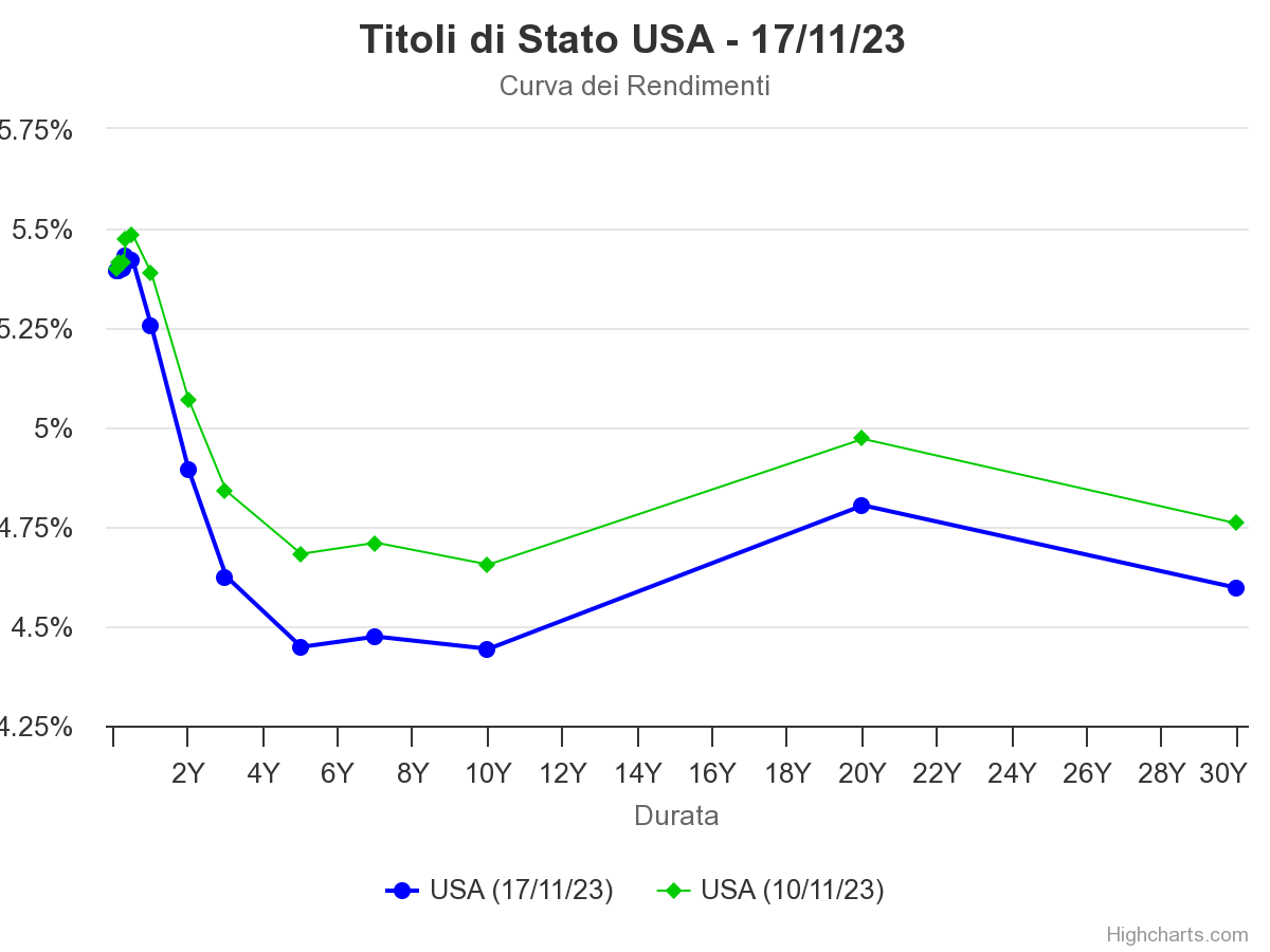 Stupisce poco che i tassi siano ancora scesi ieri, sia con il Treasury 10 anni che con il 2 anni sempre più distante dal 5% e l'azionario ha continuato a consolidare i forti guadagni della prima parte della settimana, con gli indici Nasdaq100 ed S&P500 che guadagnano un ulteriore 2% circa settimanale. I mercati festeggiano queste indicazioni, convinti che dovrebbero indurre la FED a più miti consigli.